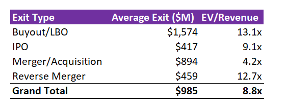 Since 2018, the average EV/revenue multiple of strategic M&A has been 4.5x, with Buyouts (PE) averaging 13.1x over that same timeframe.