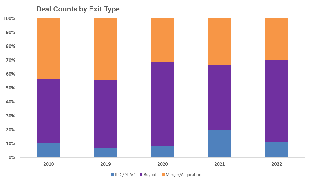 In 2018 and 2019, PE buyouts comprised ~45% of all acquisitions. Between 2020-2022, that number has jumped to near 60%.