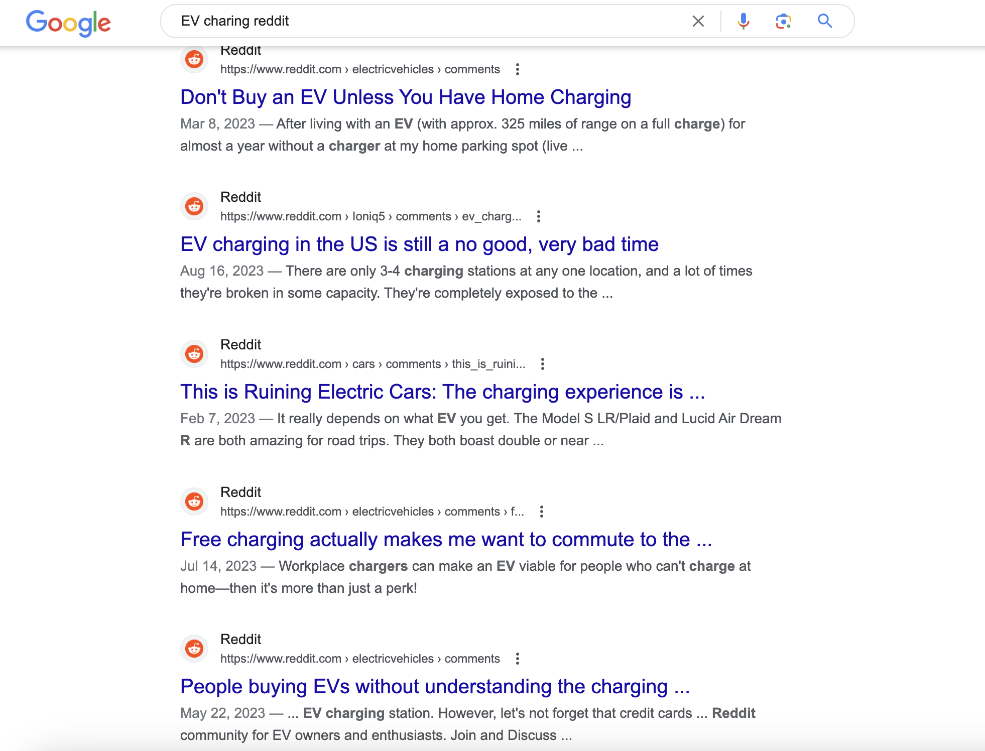 Instead, one of the first things any of us do when making a purchase is head to Google or Reddit. If you Google “EV charging Reddit,” here’s what you’ll see: