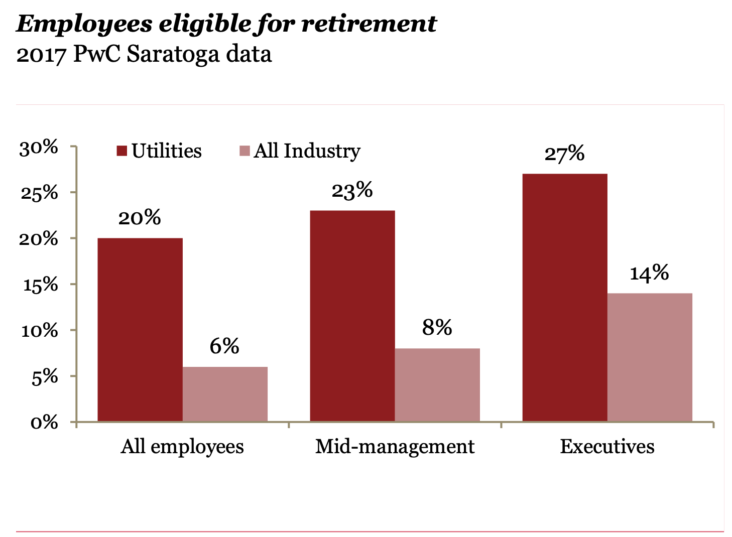 Utilities, like oil and gas, face the pending retirement of 1/3 of the workforce by 2025. Some believe the real number could be as high as 60% by 2030.