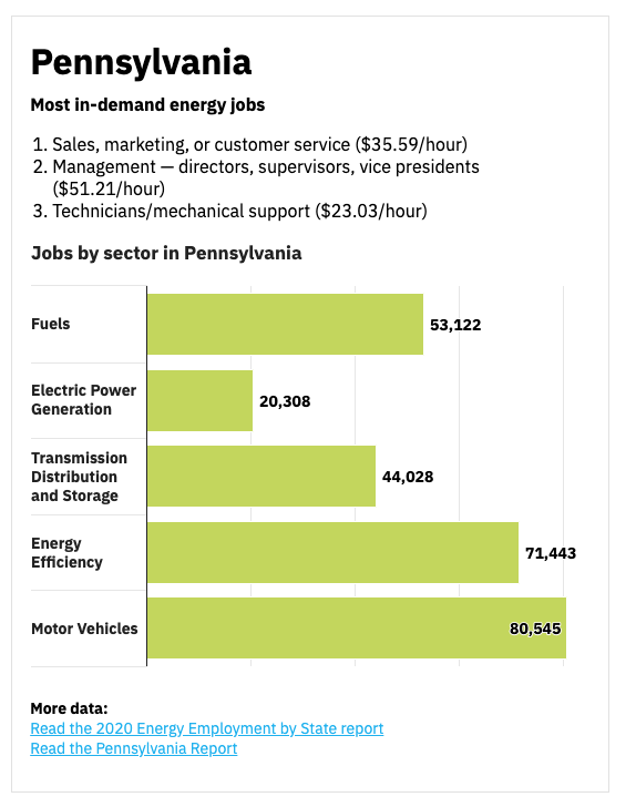 Texas isn’t the only state where jobs tied to the energy transition are among the fastest-growing. In Pennsylvania, energy efficiency is bigger than the fuels industry, and when combined with power generation and transmission, the numbers aren’t even close.