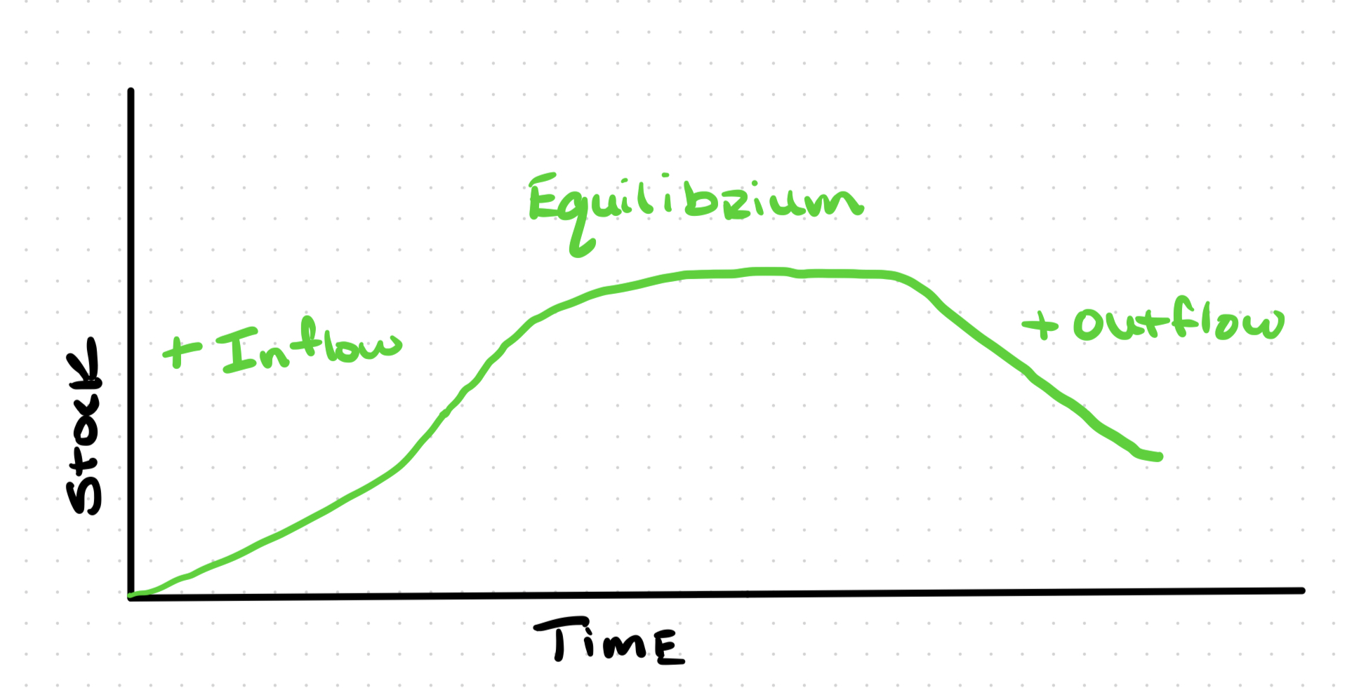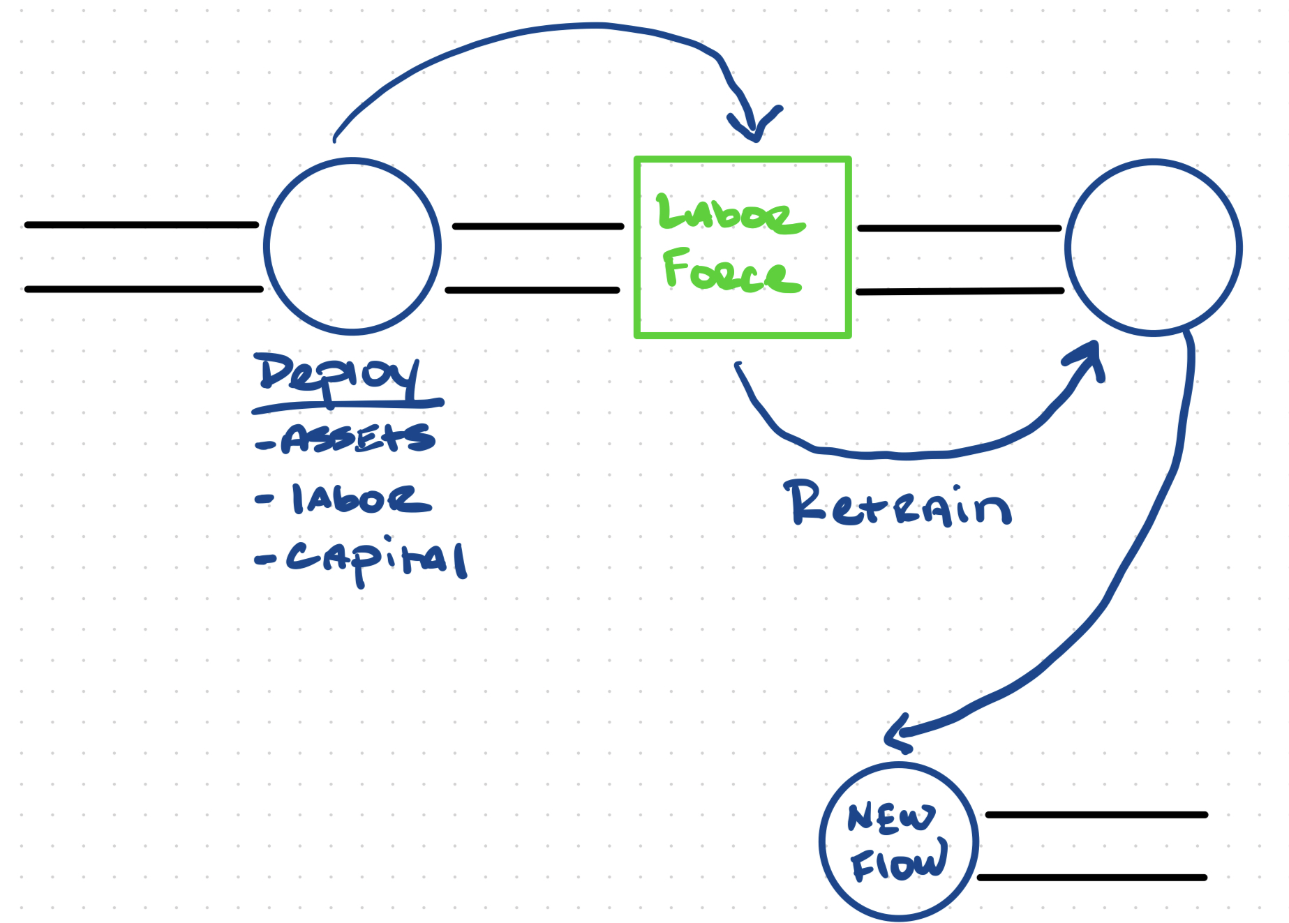 The graph above is an oversimplified version of stocks and flows. In reality, many stocks and flows interact with one another. Retraining labor for new industries highlights this example.