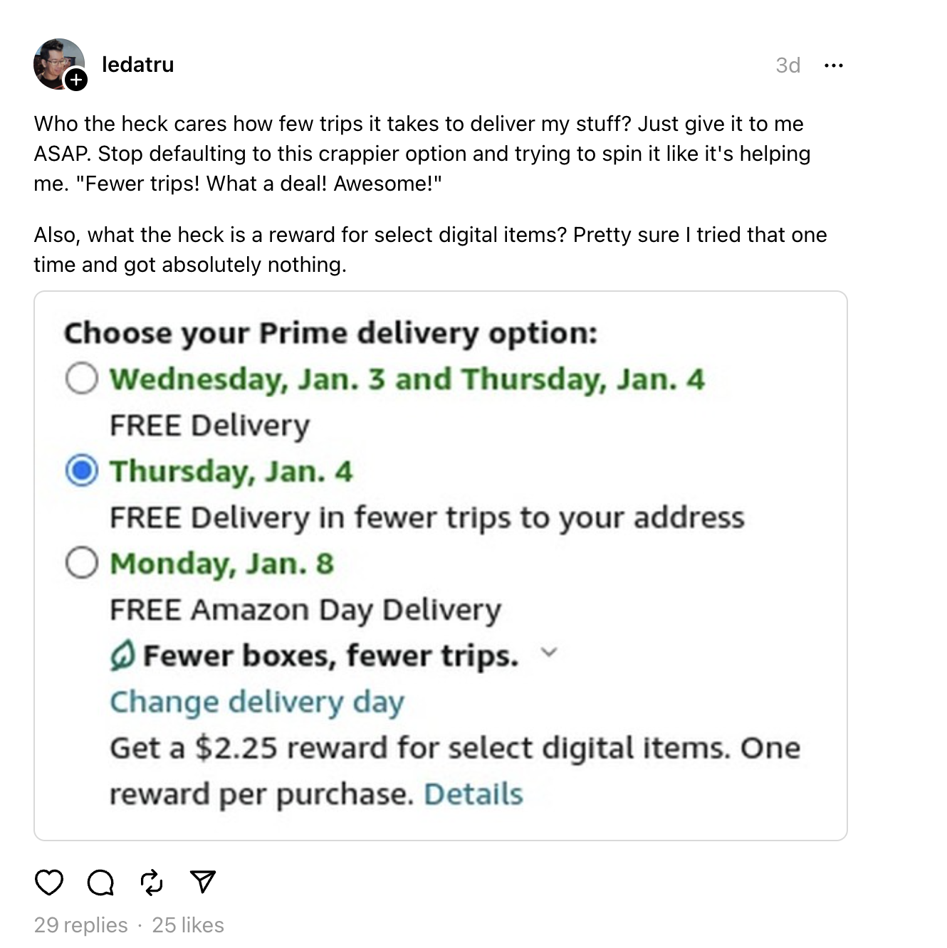 This week, the Threads algorithm surfaced a thread and subsequent replies that drove this point home. The original poster chastised Amazon for thinking he'd ever want packages in "fewer boxes." Instead, he wanted everything as quickly as possible.