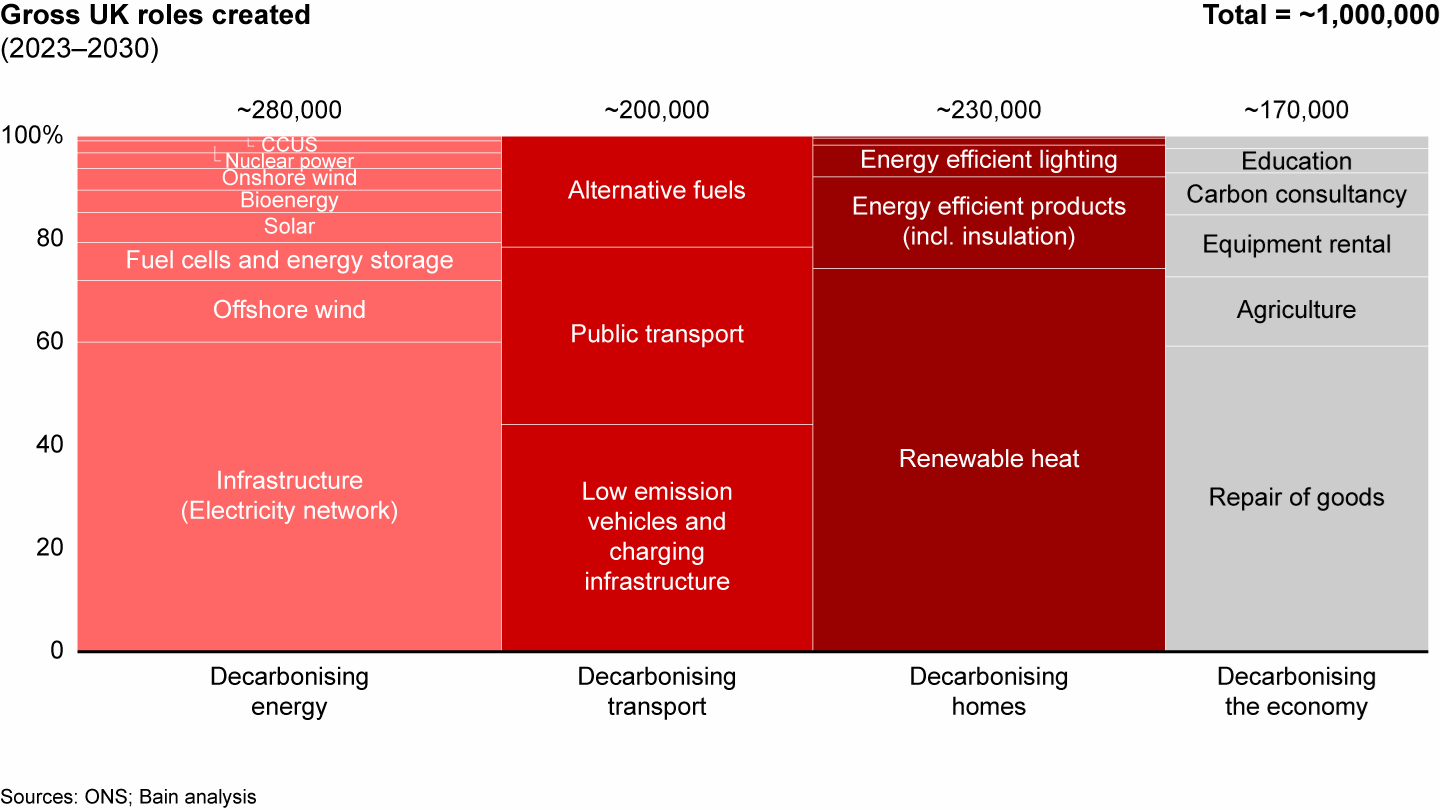 The home heating and electrician sectors are due for a boom. Bain estimates up to 170,000 new heat pump installer roles will be required, outweighing the 60,000 installation jobs lost as gas boilers phase out.