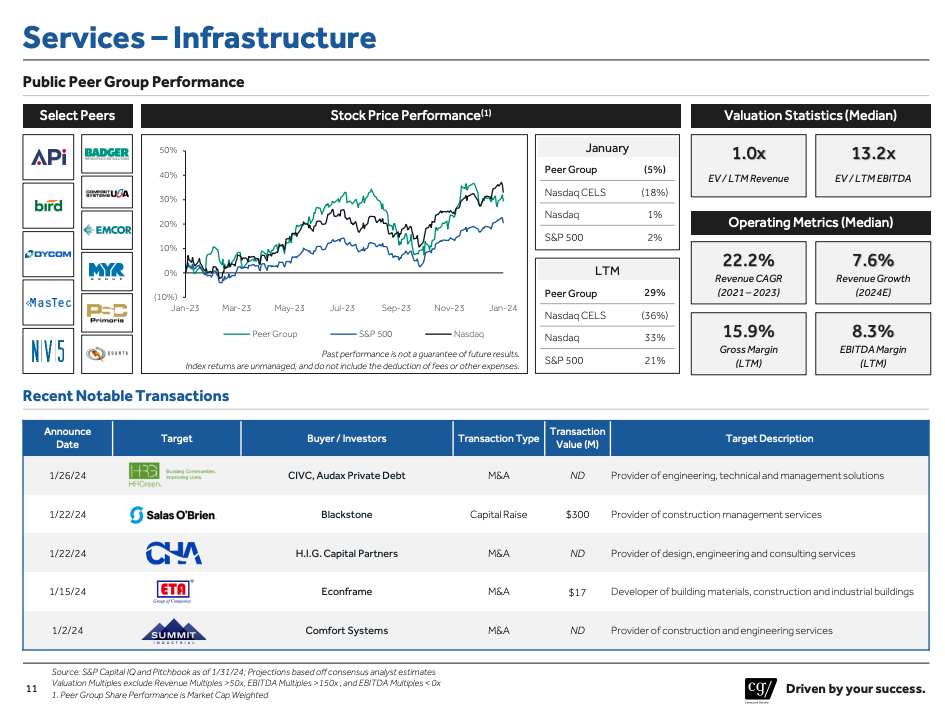 Services have also held up well in a rocky market for energy transition stocks. Over the last twelve months, infrastructure services have grown 29%, in line with the Nasdaq, while outperforming the S&P 500 and CLES by wide margins. This surprised me, but it makes a lot of intuitive sense:
