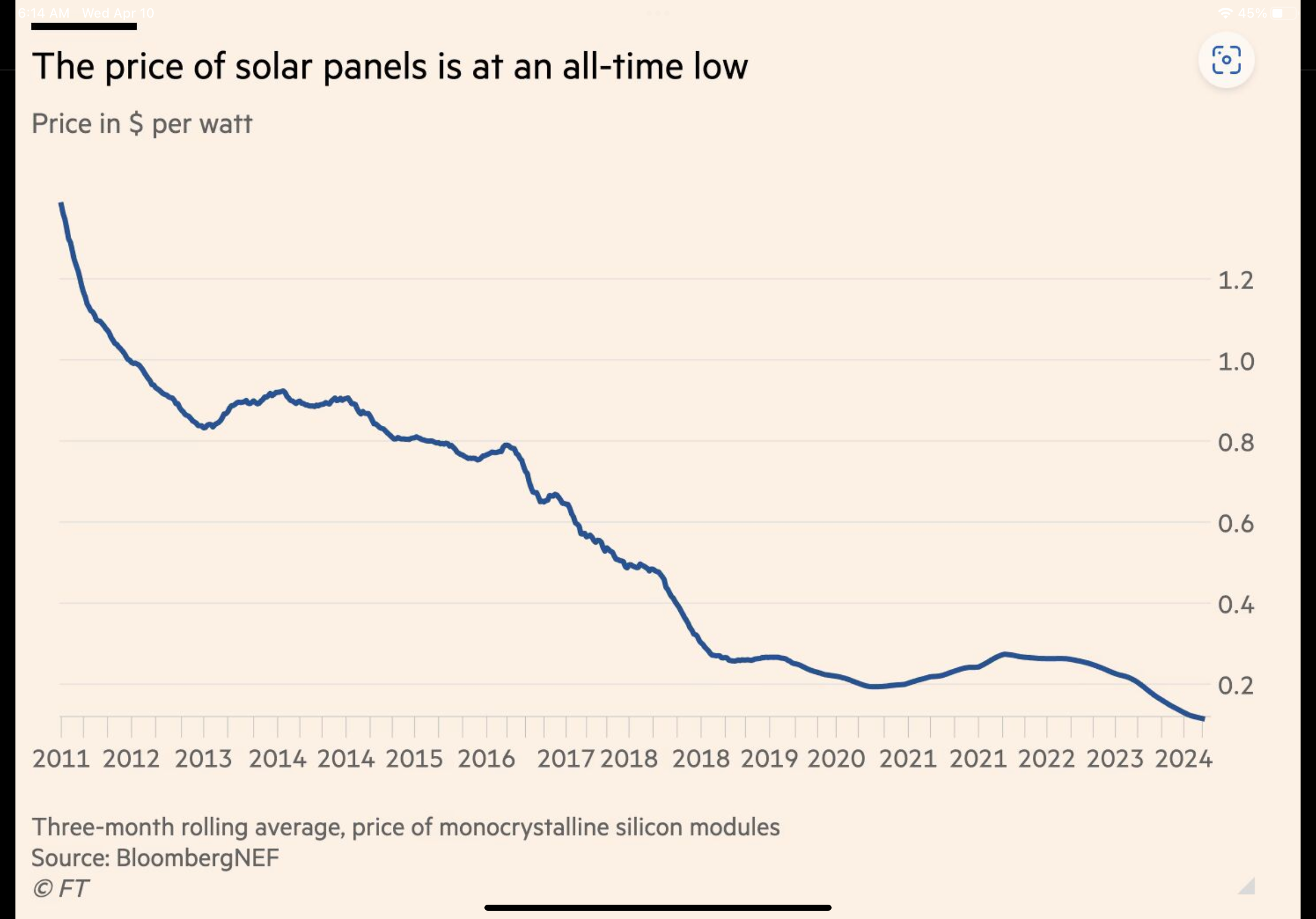 Last week, the Financial Times posted the graphs below highlighting two solar trends going in opposite directions.