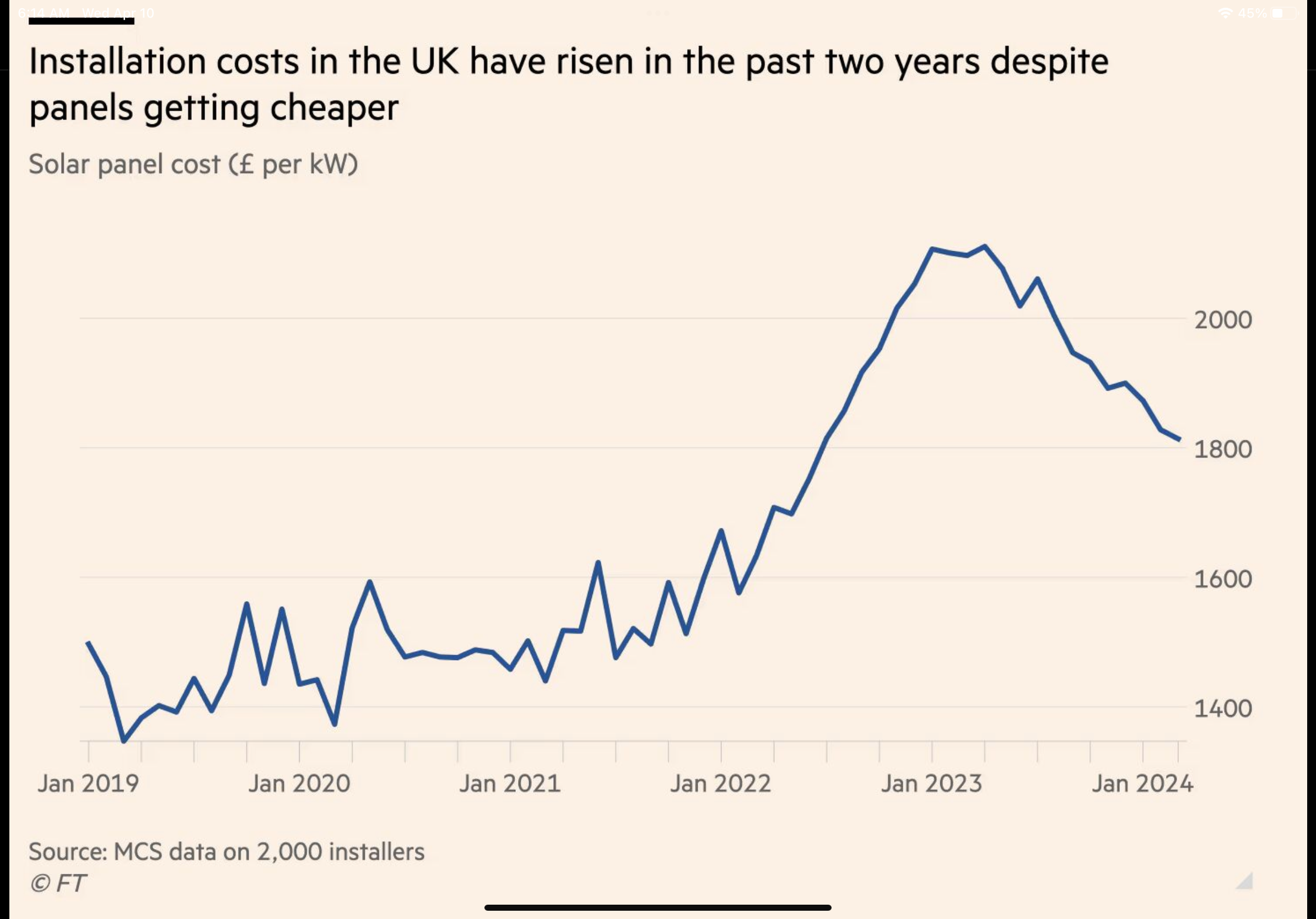 We would think that means getting solar panels on your roof has never been cheaper, but the exact opposite happened in the UK. The cost of installing solar panels on roofs has recently peaked and remains elevated.