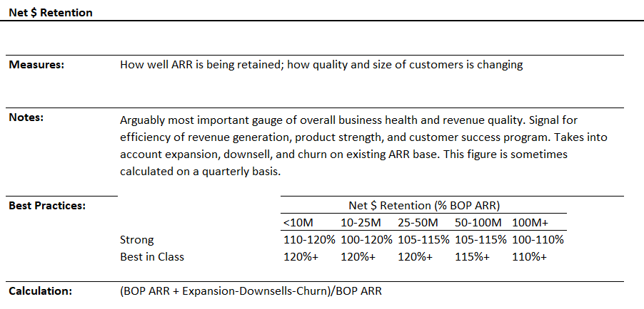Key metrics: MAU/DAU, number of projects on your platform, and customer churn. - Customer expansion - are customers expanding naturally with the product? Net revenue retention (see below) is a good indicator for customer expansion, but I like to pair it with product and seat expansions to get a sense of the key drivers of NRR outside of price increases.