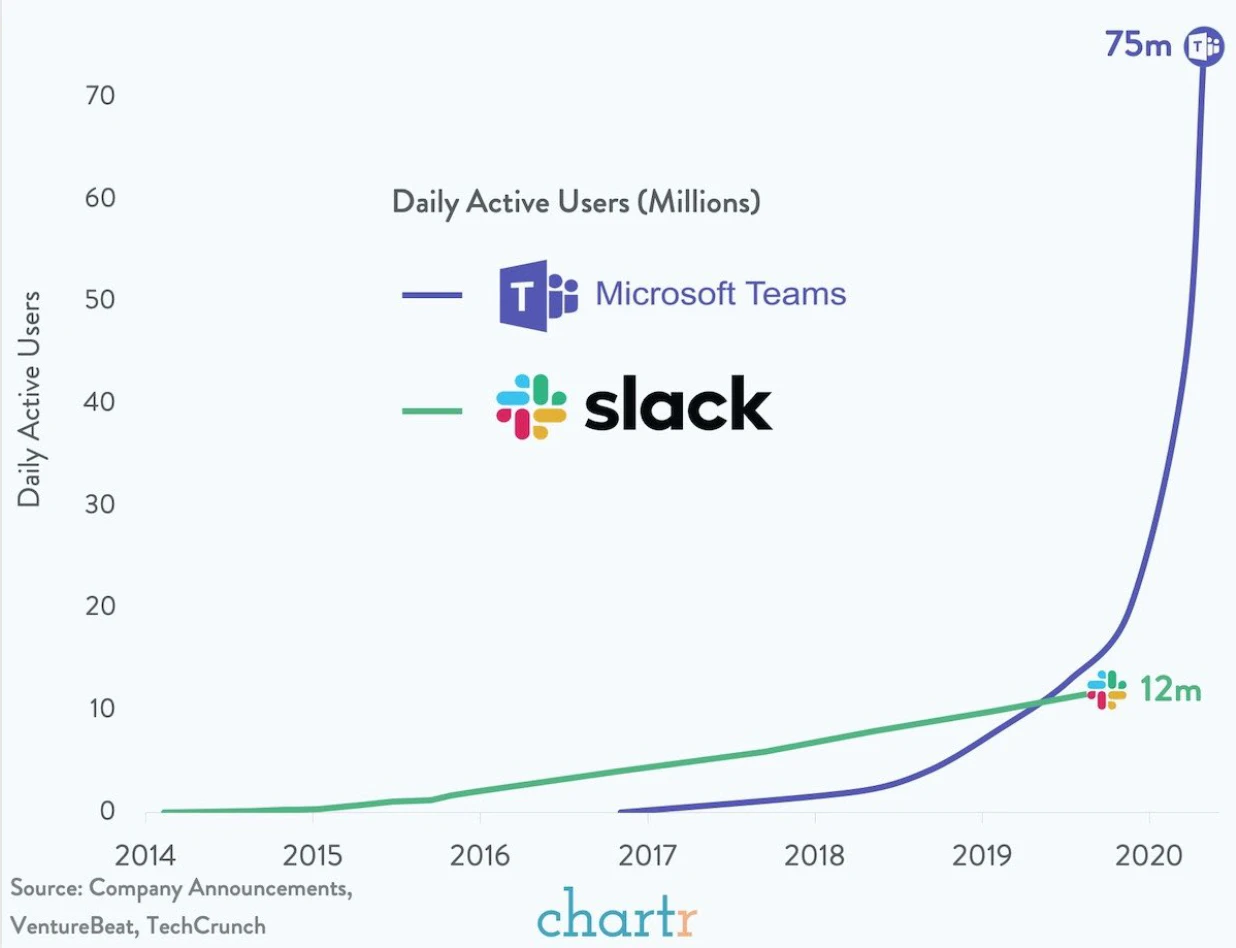 Most enterprise software aspires to be a system of record with a good UX + data collection being the first step - what I would call a system of intelligence. The next step is a system of record or a true platform advantage, few companies ever make that leap. - No distribution advantage - Microsoft is the ultimate example of the distribution advantage and they eventually used it to crush Slack. They can push products like Teams and Azure for lower costs than competitors due to their ongoing operations within companies, primarily Office and Outlook.