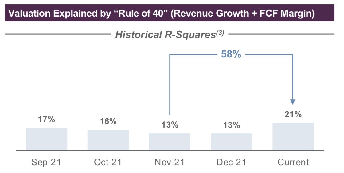 In the graphs below, you can see the shift occurring over the last month. Expected growth remains the primary driver of valuations, but the correlation has declined by 10%, while "Rule of 40" - a measure of cash efficiency - has increased by ~60%